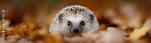 © Nakarin, Fototapeta premium Hedgehog resting on dry autumn leaves with soft focus background winter is coming in nature scene