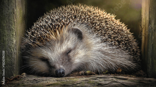 © NTGUILTY, Fototapeta premium Hedgehog resting peacefully in natural habitat during daytime