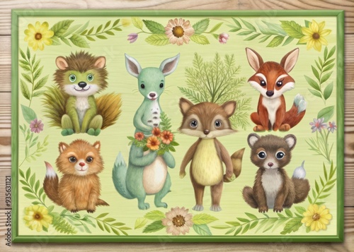 © Sirinporn, Naklejka premium hedgehog safari fox style bear animal raccoon 3d deer squirrel set hare timberland watercolor invitation clip art cute background plant illustration frame flower isolated nature wood cartoon template