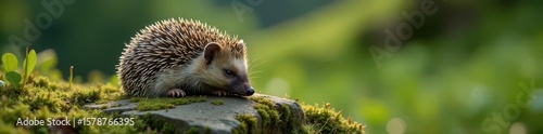 © retirementfun, Fototapeta premium Hedgehog snoozing on a mossy rock with rolled-up body , rock, hedgehog, wildlife