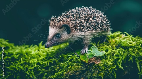 Fototapeta premium Hedgehog Walking on Green Moss with Leaf in Natural Forest Setting