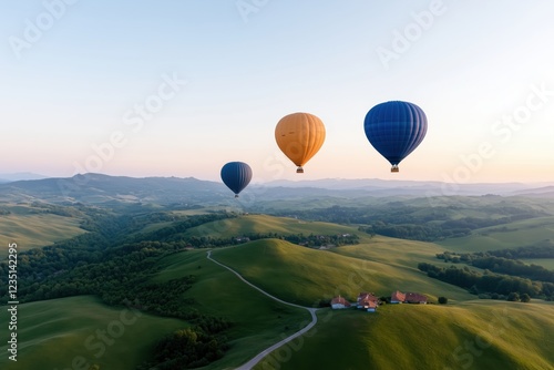© Patrick Louvet, Obraz premium Heißluftballonfahrt über eine malerische Landschaft