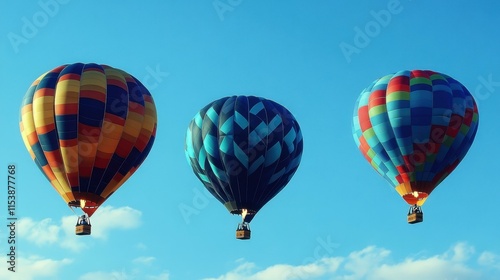 Fototapeta premium heic NFT Marketing Mlops Esg fintech Martech saas Kubernetes backup Telegram channel Second state Togetherall Wayflyer Three colorful hot air balloons with geometric patterns flying in clear blue sky