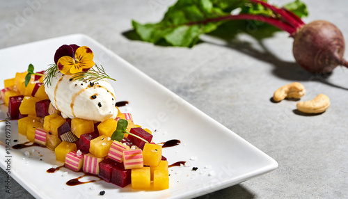 © R_Creations, Obraz premium Heirloom Beetroot Tartare with Cashew Cheese | Vegan Fine Dining