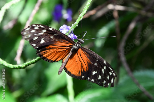 Fototapeta premium heliconius hecale tropical butterfly in nature, white spotted black and orange butterfly