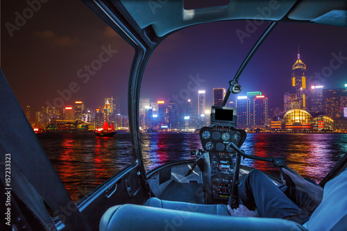 © bennymarty, Obraz premium Helicopter cockpit flying on Hong Kong panorama skyline with pilot arm.
