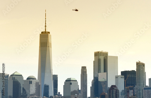 © Bumble Dee, Fototapeta premium Helicopter fly over the skyscrapers of financial district in lower Manhattan, New York, USA