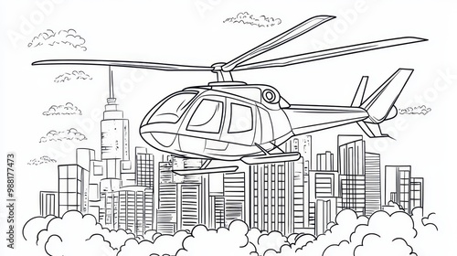 © AriyaniAI, Fototapeta premium Helicopter Flying Above Cityscape