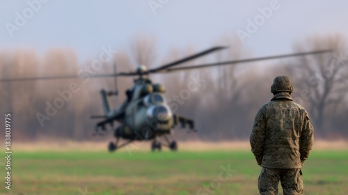 Obraz premium Helicopter military soldier in camouflage uniform standing on field, watching...