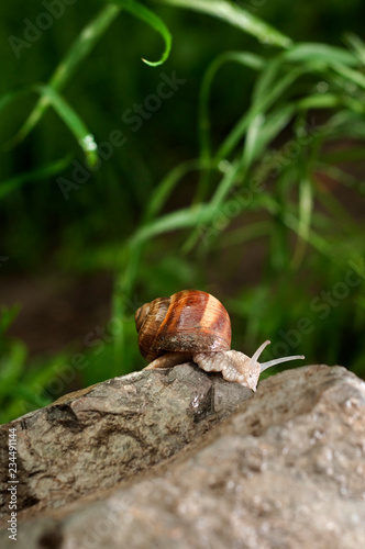 Fototapeta premium Helix pomatia on the rock in the garden after rain