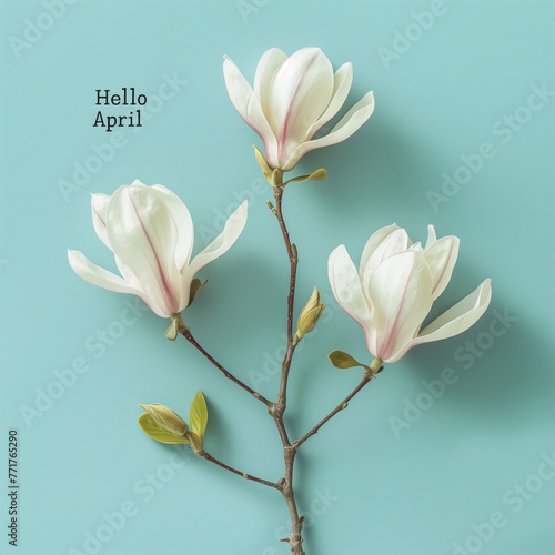 © sunaiart, Fototapeta premium Hello april text Next to a magnolia branch.Minimal creative spring concept