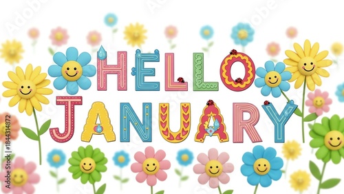© detiyy, Fototapeta premium Hello January text with flowers and ladybugs