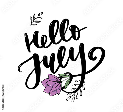 Obraz premium Hello july lettering print. Summer minimalistic illustration. Isolated calligraphy on white background.