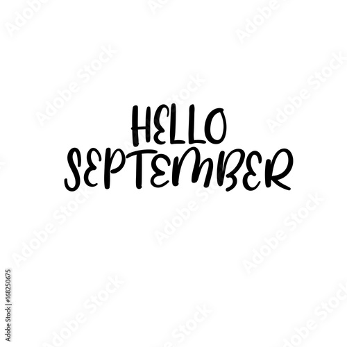 Fototapeta premium Hello September calligraphy inscription. Autumn greeting card, postcard, card, postcard, invitation, banner template. Vector brush calligraphy. Hand lettering typography.