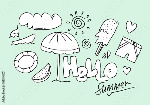 Fototapeta premium Hello Summer collection. Vector illustration of funny doodle summer symbols...