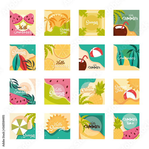 Fototapeta premium hello summer travel and vacation season banner icons set