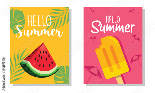 Naklejka premium Hello Summer Vector Illustration with Watermelon and Popsicle.