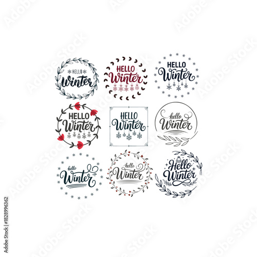 © Nusrat Jahan, Fototapeta premium Hello Winter Holiday Graphic with Botanical Elements Seasonal Hello Winter Typography with Golden Star Accents Delicate Winter Wreath Illustration Featuring Hello Winter