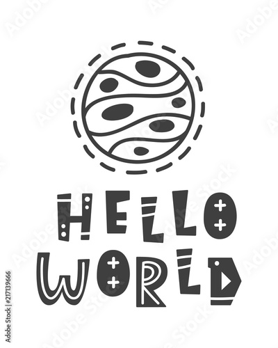 Obraz premium Hello world. Scandinavian style outer space theme lettering phrase