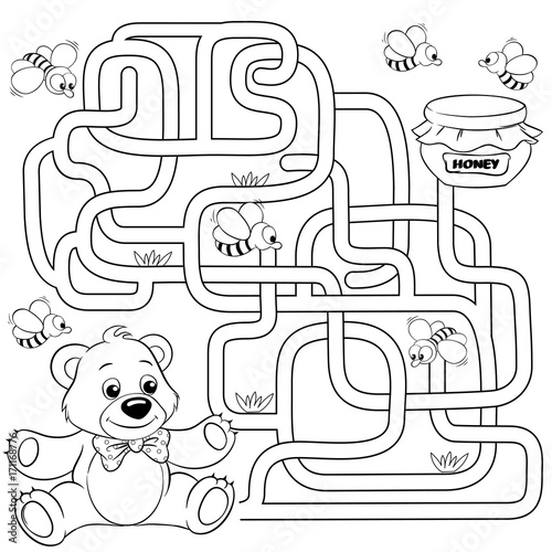 © alka5051, Obraz premium Help bear find path to honey. Labyrinth. Maze game for kids. Black and white vector illustration for coloring book