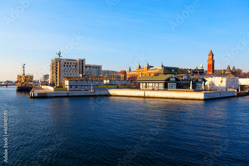 © Leilani, Fototapeta premium Helsingborg city in Sweden view from the Sea . Swedish coast and Oresund Strait