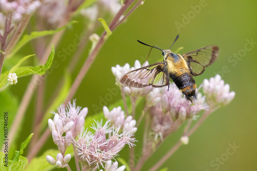 Obraz premium Hemaris diffinis, the snowberry clearwing, called "hummingbird moth" or...
