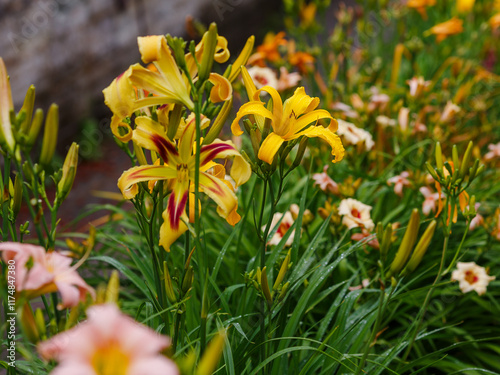 © Flower_Garden, Fototapeta premium Hemerocallis Free Wheelin blooms in garden