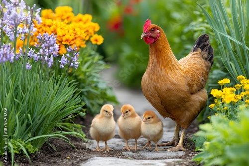 Fototapeta premium Hen fostering chicks in a vibrant spring garden
