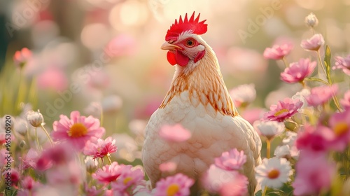 © Nuttapong, Fototapeta premium Hen in a Flower Field.