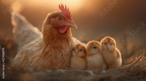 © Julia, Fototapeta premium Hen with chicks under warm midday sun