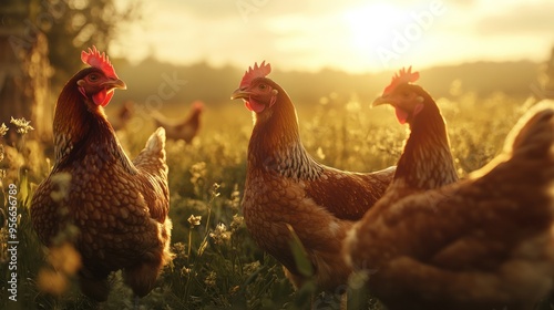© kenza07, Fototapeta premium Hens in a Golden Sunset