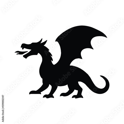 © Rajan, Fototapeta premium Heraldic Dragon Silhouette with Wings and Tail Curled Upward, a Fierce Mythical Creature.