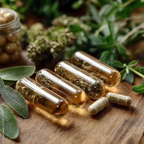 Naklejka premium Herbal Capsules and Medicinal Plants Close Up