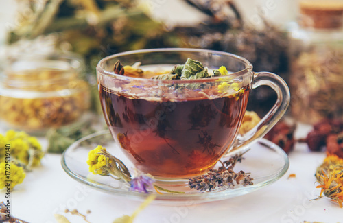 Fototapeta premium Herbal tea with medicinal herbs and flowers. Selective focus.