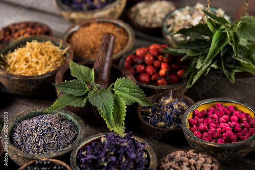 © Sebastian Duda, Fototapeta premium Herbs medicine and vintage wooden background