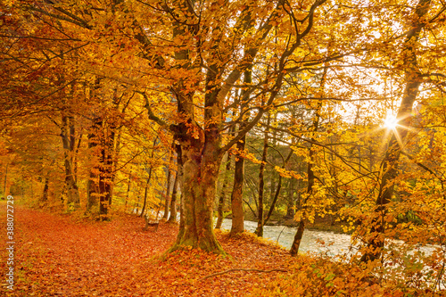 © Dominik Ultes, Fototapeta premium Herbst - Sonne - Weg - Bank - Entspannung - Allgäu
