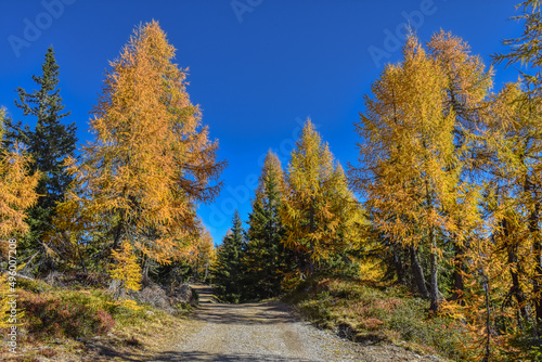 © AVR SCR, Obraz premium Herbst, Wald, Baum, Bäume, Lärche, Lärchen, Blätter, Nadeln, verfärben, Farbe, Herbstfarben, Gelb, Gold, Braun, Grün, leuchten, Strahlen, farbenfroh, Weg, Wanderweg, Ast, Äste, Stamm, Baumstamm, Hang,