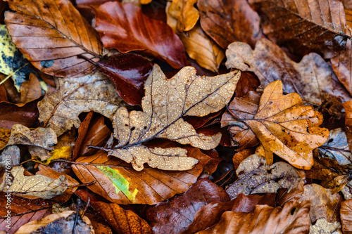 Fototapeta premium Herbstlaub mit Wassertropfen