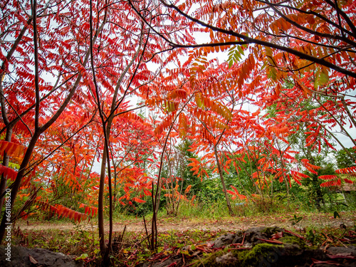 © focus finder, Naklejka premium Herbstlich gefärbte Blätter eines Götterbaums