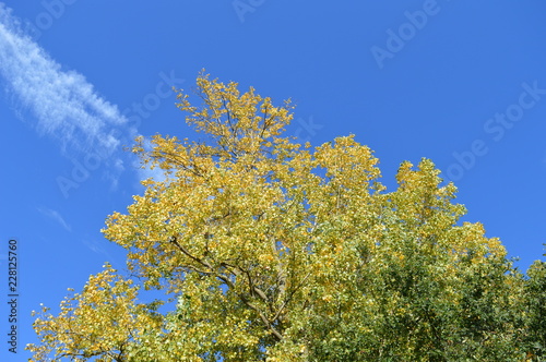 Fototapeta premium Herbstlich gefärbte Pappel vor blauem Himmel mit Cirruswolken