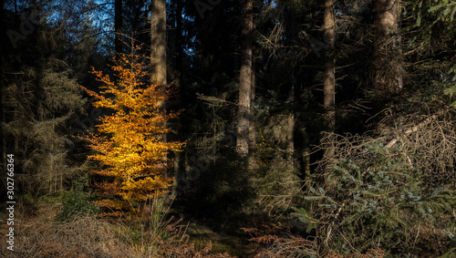Fototapeta premium Herbstlich leuchtender Buchenbaum im dunkeln Wald.