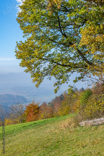 Fototapeta premium Herbstlich verfärbte Bäume auf einem Hügel mit Blick ins nebelverhangene Tal
