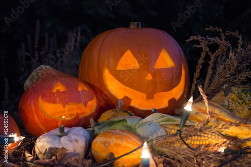 Fototapeta premium Herbstliche Kürbisse mit Lichtern und Gemüse
