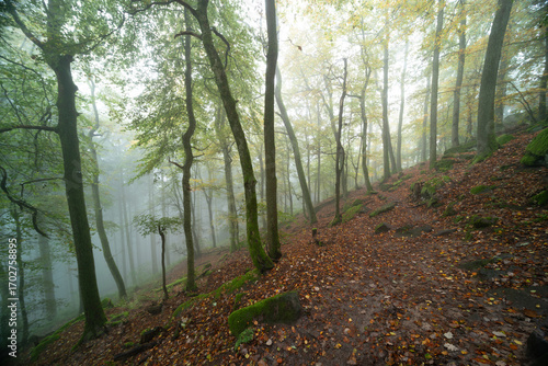 Obraz premium Herbstliche Nebelstimmung im Pfälzerwald entlang der Südlichen Weinstraße