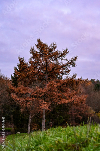 Fototapeta premium Herbstlicher Baum im Sonnenuntergang in einm Park