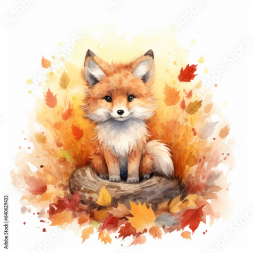 Obraz premium Herbstlicher Charme: Wasserfarbenzeichnung eines niedlichen Fuchswelpen im goldenen Laub, Generative AI