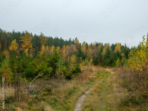 Fototapeta premium Herbstlicher Eggeweg durch jungen Mischwald im Teutoburger Wald