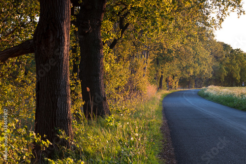 © Adam, Obraz premium Herbstsaison mit einer rechts abbiegenden Asphaltstraße