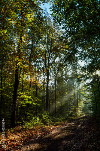 © stadelpeter, Fototapeta premium Herbstwald mit Morgensonne