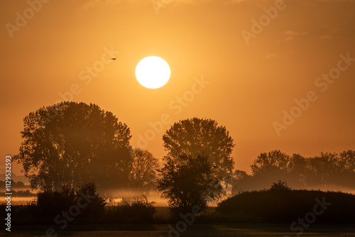 © Kati Sommer , Obraz premium Herbstzauber am Stausee Kelbra (Thüringen, Deutschland). Die aufgehende Sonne taucht die Landschaft in ein goldenes Licht. Nebel liegt auf den Wiesen.